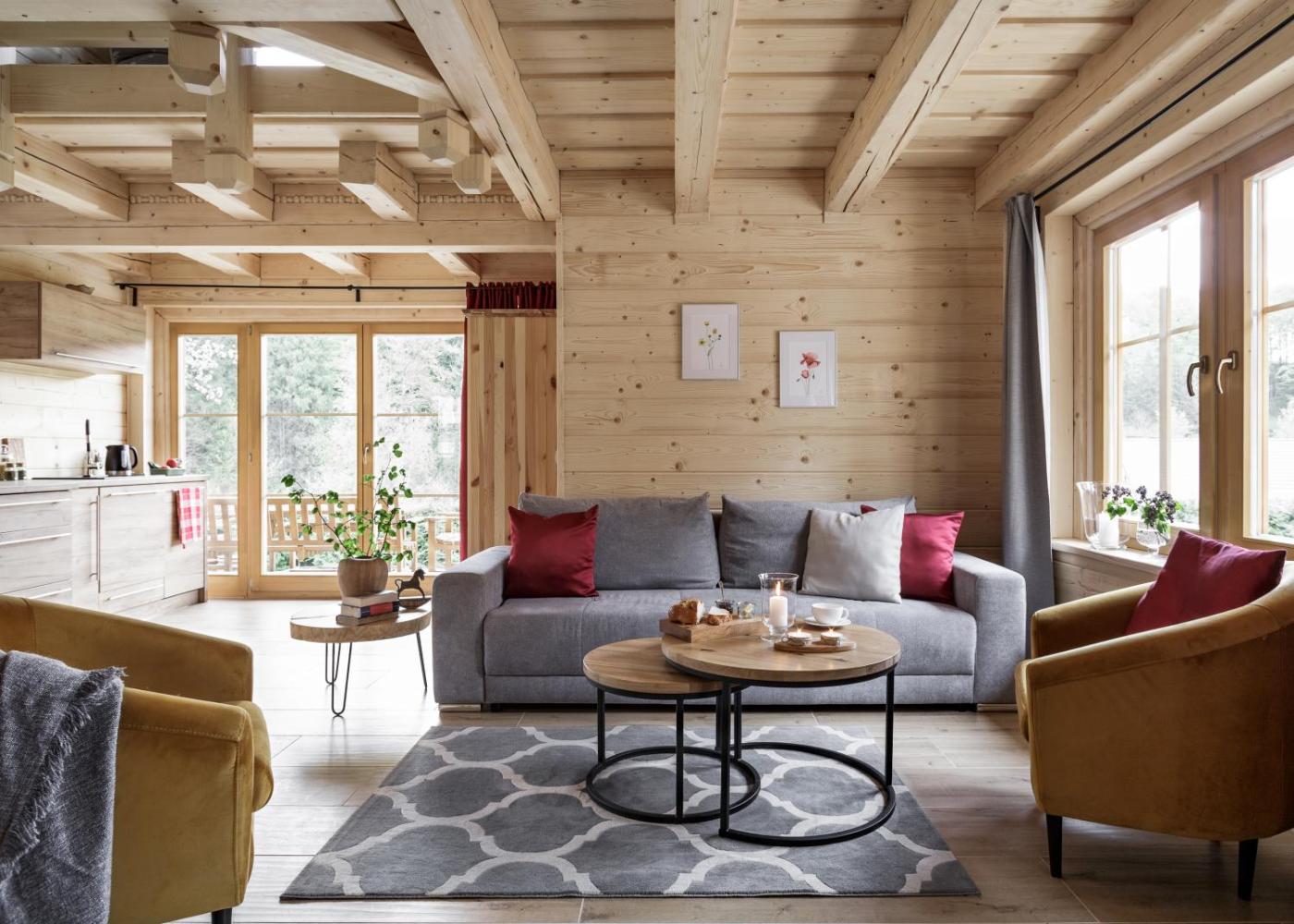 Domek z 2 sypialniami. This spacious chalet is comprised of 1 living room, 2 separate bedrooms and 2 bathrooms with a bath and a shower. Guests will find a stovetop, a refrigerator, a dishwasher and kitchenware in the fully equipped kitchen. The chalet also has a barbecue. Featuring a terrace with garden views, this chalet also offers a private entrance and a flat-screen TV with satellite channels. The unit offers 5 beds. Domek - 8 osobowy. Powierzchnia pokoju ok.: 80 mkw.